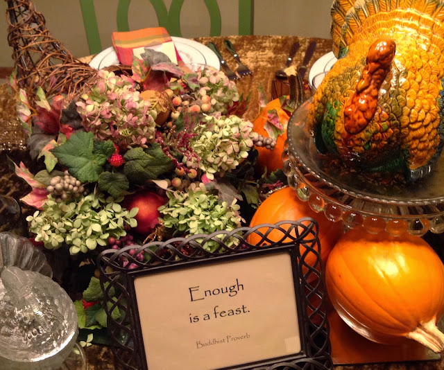 If you've read my last post, you know how much I love quotes and how I used them on the place cards. I've also added one more quote in a frame to "bring the message of gratitude home", so to speak. To me, this one is perfect for the occasion.